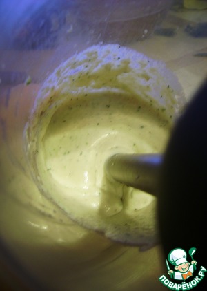От грудки отделить половинку филе и пробить его в блендере с творожным сыром, веточкой укропа и мятой.