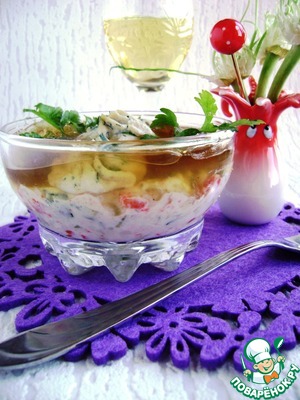 Интересный салат. Нежное куриное суфле как основа и заправка, кисло-сладкое манго и хрустящий огурчик, мята и укроп, желе на курином бульоне с шампанским…Ну, накрутила одним словом, разгулялась. Получилось вкусно и легко, необычно и празднично. Удивить девочек на 8 марта-в самый раз!