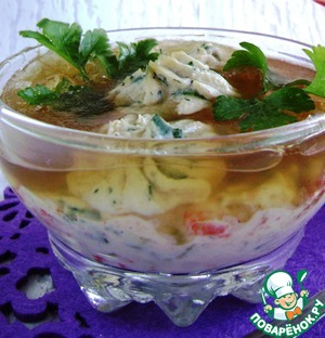 Подогреть полстакана бульона с шампанским и влить в оставшийся желатин. Хорошо размешать и процедить. Аккуратно залить мусс доверху, украсить листочками петрушки и оставить в холодильнике до полного застывания.