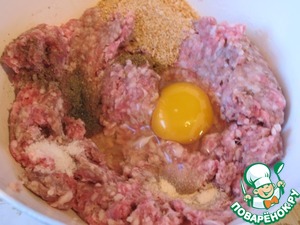 В фарш добавить яйцо, сухари, измельчённый чеснок, соль и чёрный перец.