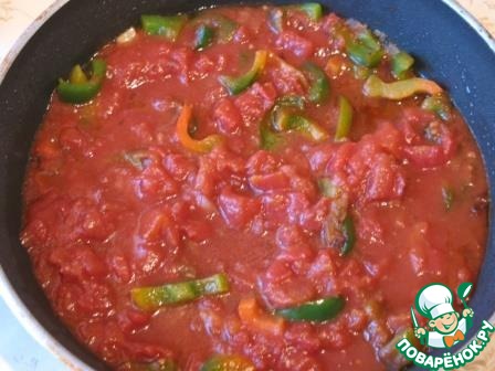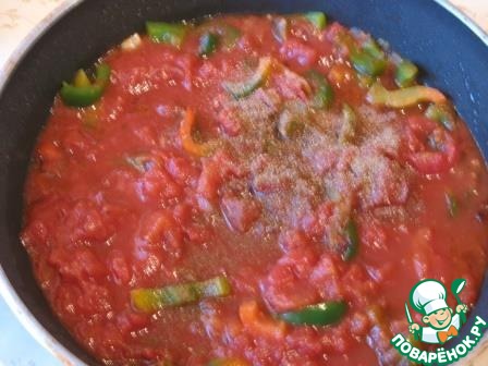 Добавить чеснок, чили (если используете) и специи, жарить 1 минуту, после чего добавить помидоры вместе с соком (если у вас помидоры целые, то их нужно предварительно размять), влить воду или бульон.