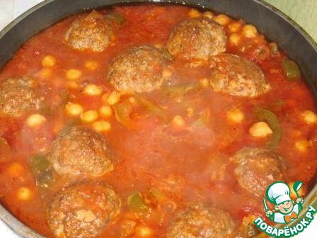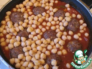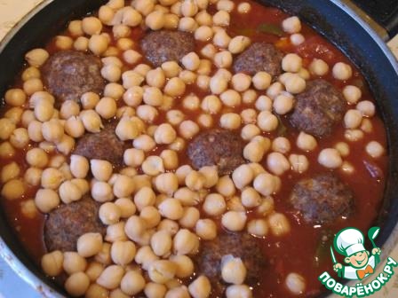 Затем добавить в соус готовые фрикадельки и отваренный нут.
