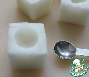 Вырезаем углубление в каждом кубе - размер определите сами - в углубление будем класть майонез с карри.