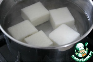 В кипящую воду опускаем кубы на 2-3 минуты сразу остужаем в ледяной воде и осушиваем - дайкон остается хрустящим.