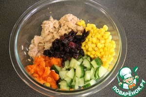 Для начинки смешиваем тунец, кукурузу, мелко нарезанные отваренную морковь и свежий огурец и клюкву.