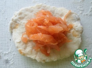 От расстоявшегося теста, отрываем не большой кусочек, разминаем пальцами, в центр выкладываем начинку.