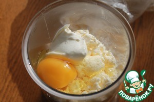 Миксером взбить творог, яйцо, 2 ст. л. сметаны, соль (щепотку) и муку до пышной массы.