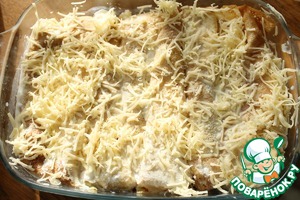 В миске смешать молоко с 2 ст. л. сметаны, посолить по вкусу и залить блинчики. Натереть сыр и посыпать сверху. Выпекать 20 минут при температуре 200 гр.