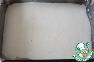 Форму (у меня размеров 30 на 22) проложить пергаментом и смазать маслом. Вылить тесто в форму, распределить равномерно по всей поверхности. Из указанного количества ингредиентов получается 2 блина, я выпекала их по очереди.