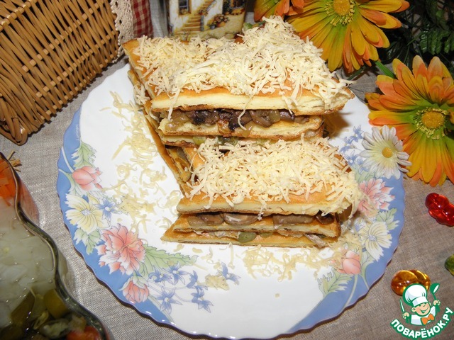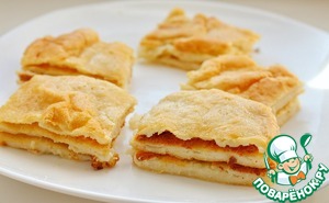 Выпекать в предварительно разогретой до 225 градусов духовке 30 минут, пока блин не приобретет золотистый цвет и не поднимется. Готовый блин остудить и порезать на квадраты.