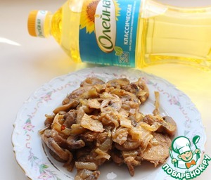 На сковороде разогреть растительное масло. Добавить лук, обжарить на среднем огне до прозрачности. Добавить шампиньоны и обжаривать 5-7 минут до готовности.