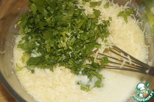 Всыпать оставшуюся муку, натертый на мелкой терке сыр и рубленную зелень. Перемешать тесто.