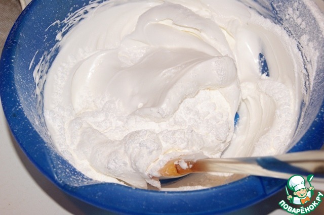 В три приема ввести пудру, перемешивая лопаткой методом складывания снизу вверх и по кругу.