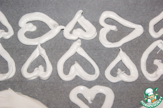 На оставшемся пространстве отсадить сердечки. Если у вас маленький противень, то поместить меренгу в холодильник и выпекать сердечки после коржей. Украшения выпекаются немного быстрее, приблизительно час.