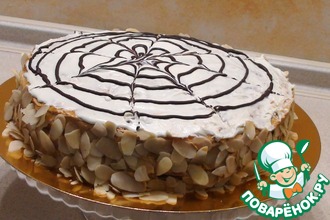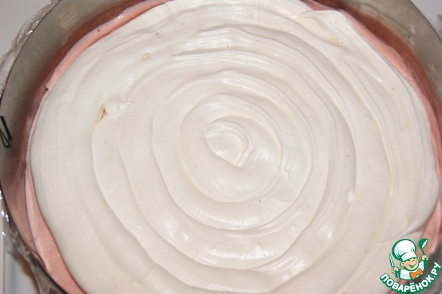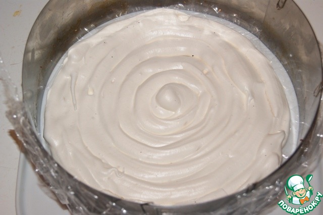 Сверху нанести половину крема и накрыть вторым коржом-безе.