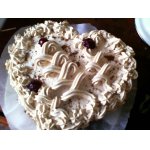 Я украсила, прилепив по бортику безе в форме сердечек. Верх украсила взбитыми сливками и сердечками из желе, поместила в центре два сердца из безе.