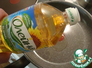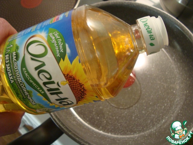 Делаем начинку для блинов. На сковороду наливаем масло подсолнечное. Я взяла "Олейна".