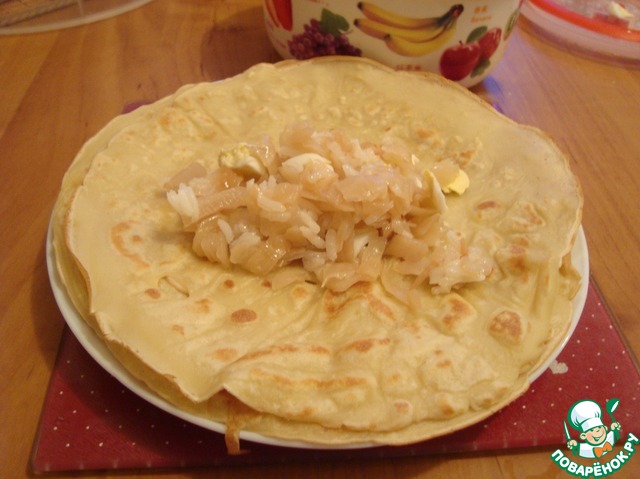 Я очень люблю капусту в блинах и делаю очень часто. Сегодня я приготовила блинчики с просто чуть обжаренной капустой, луком и добавила в капусту рис отварной и перепелиные яйца. До чего же хороши!