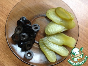 Маслины нарезать тонкими кружочками, огурцы тонкими пластинками. Яйца отварить и остудить.