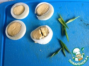 Лук нарезать наискосок. Яйца тонкими кольцами.