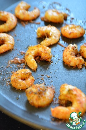 Прованские травы, красный, черный, перец чили, паприку, соль, чесночный порошок и гвоздику растереть в ступке. Креветки разморозить, очистить и обвалять в этой смеси.