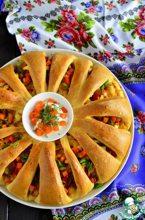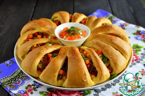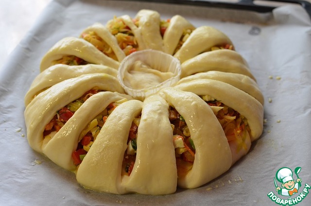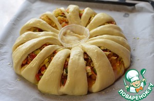 5) Выложить начинку на тесто, завернуть края к центру. В центр я поставила формочку для кекса, чтоб не затянулось кольцо. Дать пирогу расстроятся 20-30 минут, обмазать желтком и выпекать в предварительно разогретой духовке до 180 градусов, 35 минут.
