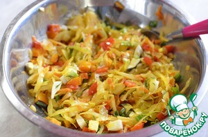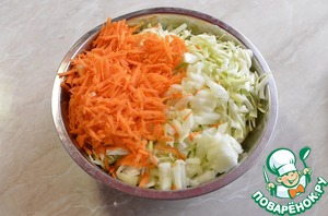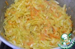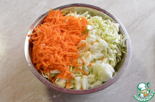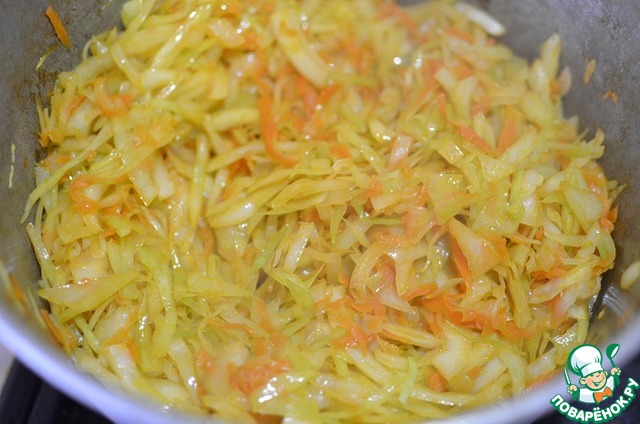 2)Морковь лук почистить, лук порезать кубиками, морковку натереть на крупной терке. Капусту нашинковать. На небольшом количестве растительного масла про тушить, не доводя до готовности. Посолить. Начинку остудить.