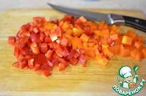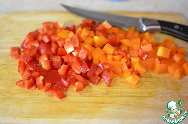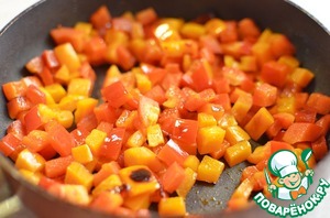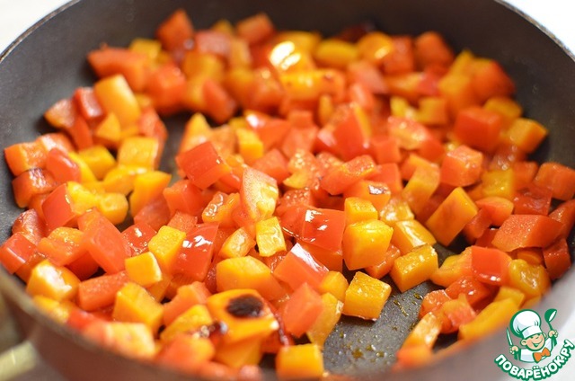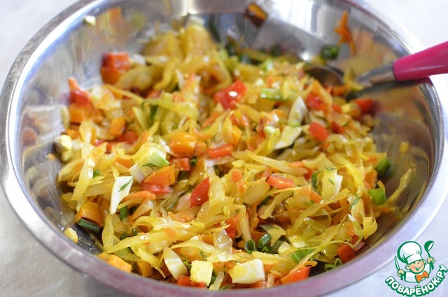 3) Сладкий перец вымыть, порезать кубиками. Обжарить на небольшом количестве растительного масла. Остудить. Капусту перемешать с перцем. Я дополнительно в начинку добавила отварное яйцо и зеленый лук.