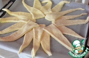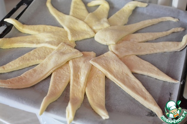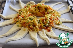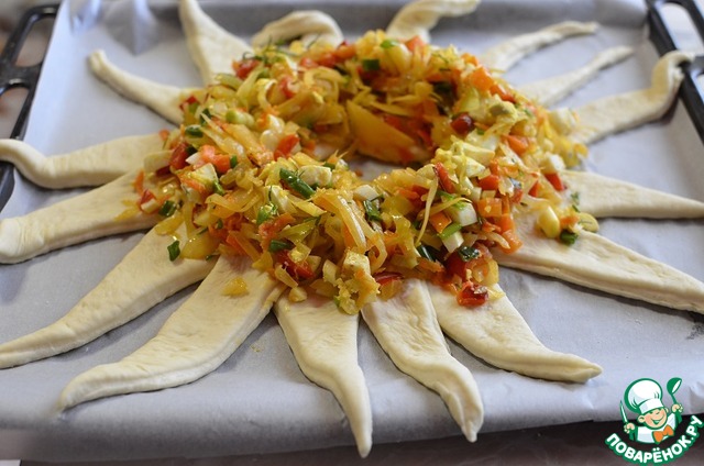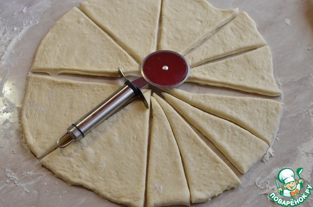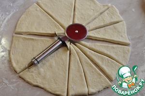 4) Тесто раскатать в большой круг, размер круга делаете под ваш противень, чтоб на нем можно было собрать пирог. Разрезать тесто круглым ножом как на фото. Переносим треугольники-лепестки на противень застеленный пекарской бумагой.