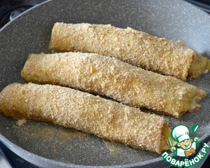 В глубокой широкой миске размешать вилкой яйца. В другой тарелке приготовить панировочные сухари. Каждый блинчик сначала обвалять в яйцах, а затем в сухарях.