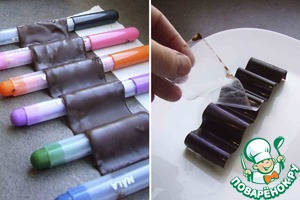 Шоколад топим на водяной бане и наносим на заранее вырезанную полоску из плотного полиэтилена.