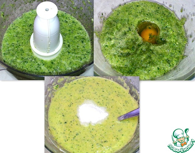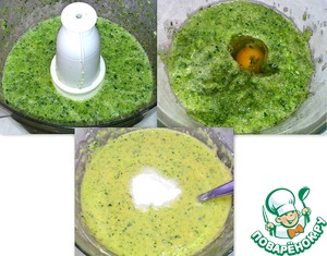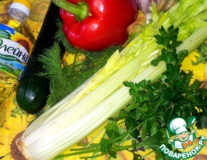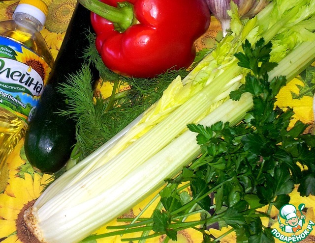 Цуккини, сельдерей, петрушку, укроп нарезала и положила в чашу комбайна.