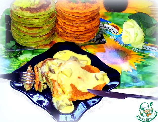 Часто пеку блины из разных овощей. Эти блины двух видов. Зелёные из цуккини с сельдереем. Оранжевые из болгарского красного перца. Соус к таким блинам из овощей можно подобрать на ваш вкус.