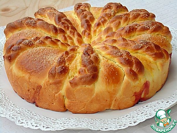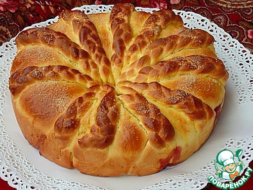 Красивый венок с потрясающей начинкой из вишни, грецких орехов, корицы и яблока! Получилось очень-очень вкусно!! Рекомендую!! Мое кулинарное признание моей маме!! Как готовит мама вкусно пироги, так, наверно, я никогда не научусь.