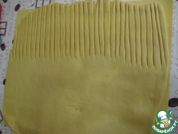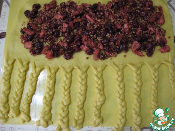 Тесто обмять, выложить на присыпанный слегка мукой пергамент и раскатать в прямоугольник. Половину теста нарезать на полоски, сплести косички.