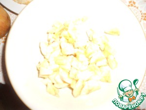 Добавить промытый изюм. Растопить сливочное масло на сковороде, добавить нарезанный банан с изюмом и припустить течении 4-5 минут.