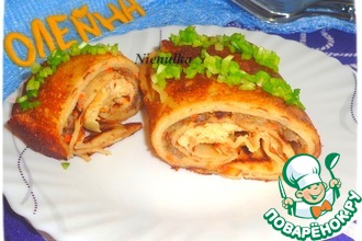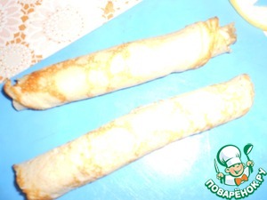Остудить начинку, на блин выложить начинку по длине. Свернуть блин в трубочку. Нарезать свернутые трубочки наискосок 2 части.
