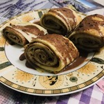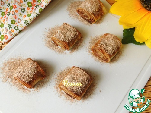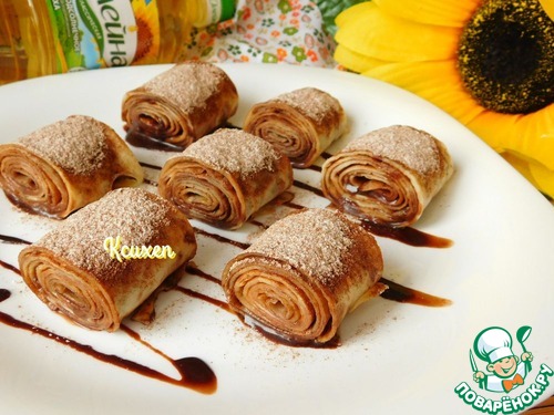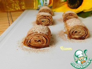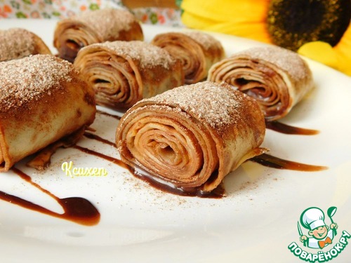Промазываем каждый блинчик тёплым соусом и сворачиваем рулетом. Я сделала рулеты, сложив три блинчика вместе, промазав каждый блинчик соусом. Разрезаем каждый блинный рулет на небольшие рулетики. Каждый рулетик присыпаем смесью какао-порошка и сахарной пудры и сразу подаём.