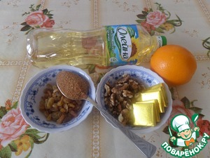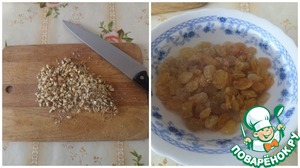 Изюм промываем и заливаем горячей водой. Рубим ножом орехи.