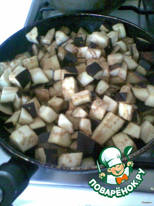 Баклажаны порезать кубиками и обжарить в оливковом масле, выложить в казанчик