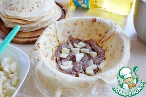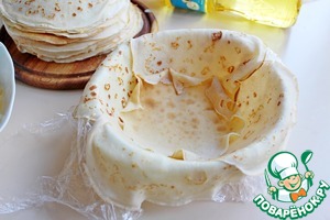 Поверх пленки выложить 3-4 блина внахлест чтобы края немного свисали.