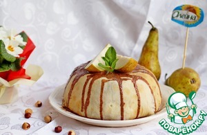 Снять пленку, перевернуть торт на тарелку, украсить грушей и полить шоколадным соусом.