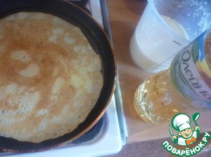 Приготовить тесто для блинов ( у меня в этот раз были блины на сметане: 1 яйцо, 2 ст. л. сахара,180гр сметаны, 0,25 ч. л. соды, 200 МЛ муки,120 мл молока и 2 ст. л. растительного масла Олейна)