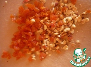 Курагу промыть, мелко порубить. Арахис обжарить на сухой сковороде (минуты3-4) и мелко порубить.