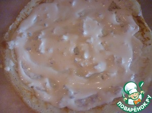 Выложить начинку ровным слоем на всю поверхность блина. -