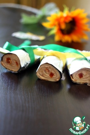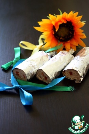 Свернуть рулетом и поставить в морозилку на 2 часа. Разрезать пополам и подавать.