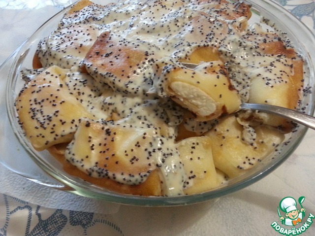 Рецепт приготовления этих блинов, вернее именно их формовка и приготовление мне знаком с детства. Так готовила блины моя мама, а затем я часто пекла такие блинчики своему маленькому сыну, ему они оочень нравились и даже сейчас когда сын уже стал взрослый парень и все равно эти блины ему очень по душе!! Он очень любит когда я их готовлю. Вся прелесть в форме, они фаршируются творогом маленькими, буквально на 1-2 укуса, но и конечно, важен момент их приготовления, эти блины томятся в духовке в горшочке 1-2 часа при минимальной температуре. Их можно смазывать просто сл маслом и томить или как я сегодня приготовила, в хорошей деревенской сметане с добавлением мака. Блины пропитываются нежным кремом и становятся необыкновенно нежными и вкусными. Обязательно попробуйте и вы, уверена они вам понравятся!! Для тех у кого нет времени то можно готовить в духовке меньше времени но при более высокой температуре.