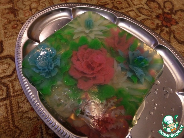 Если задуман цветок с узкими лепестками, то работаем одним шприцом. Начинаем погружать иглу в середину формы, вертикально и одновременно выдавливая цветное желе. Постепенно угол укола изменяем, формируя цветок. Лепестки можно делать очень тонкими, а можно потолще, для чего иглу при погружении двигаем на 2-3 мм в стороны. Немного тренировки и у вас все получится. Главное, не доводите иглу до дна и стенок формы, иначе рискуете получить пятно, которое испортит прозрачность десерта.