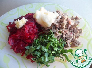 Готовую печенку остудить и мелко порезать, добавить к ней измельченную зелень, натертую вареную свеклу, чеснок и 2ст. л. соуса. Подсолить по вкусу.