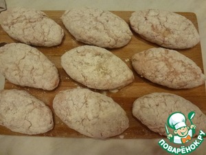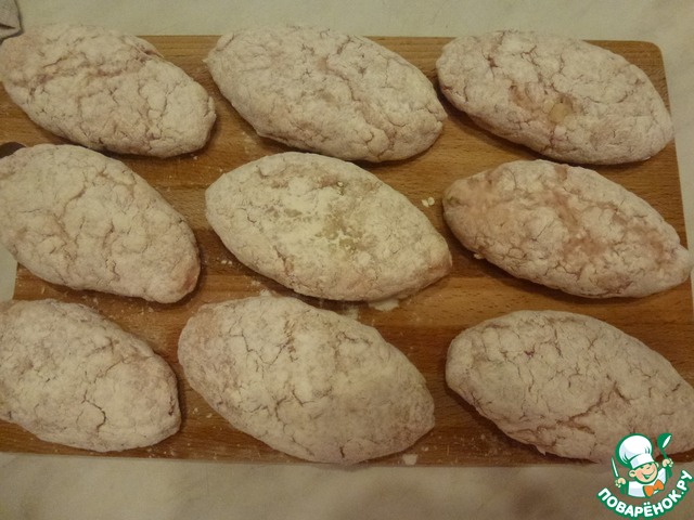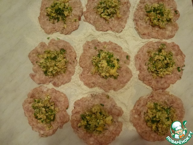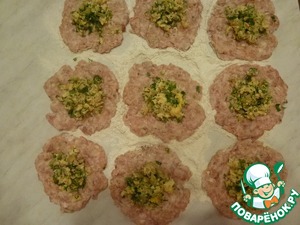 Из фарша формируем лепешки и выкладываем на них начинку. Лепешки сворачиваем и склеиваем, чтобы фарш оставался внутри лепешки.